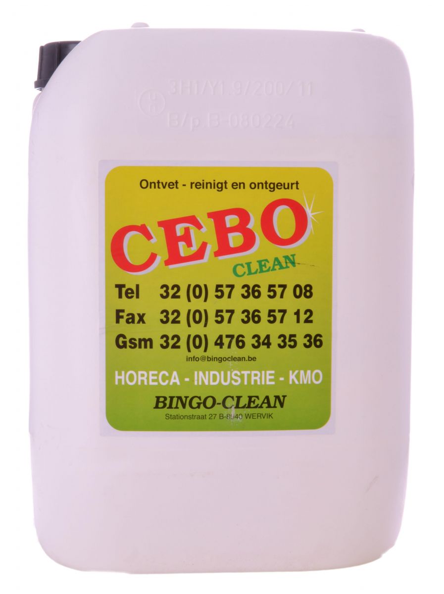 Professioneel ontvettingsprodukt ontworpen voor grootkeuken, slagerij, bakkerij, vishandel, horeca, industrie, frituren, garages, e.a. Voor het moeiteloos reinigen van alle ovens, kookfornuizen, steamers, dampkappen, frigotoonbanken, muurtegels, vloeren, machines, e.a.... CEBO-CLEAN is een geconcentreerd product, dat dankzij de juiste toepassing, voordelig is in gebruik. Bij regelmatig gebruik van CEBO-CLEAN vermijdt u verstopping van het buizen- of rioleringsnet zonder aantasting ervan.